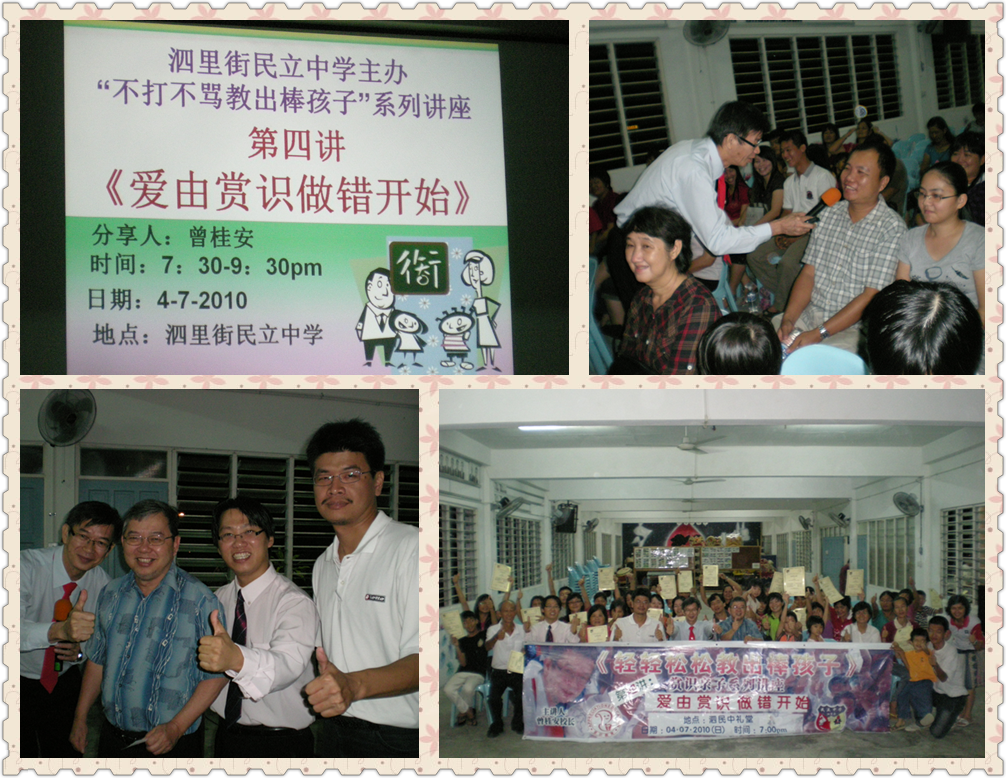 10-07-04 行知赏识亲子讲座《爱由赏识做错开始》 myxingzh / July 4, 2010 行知赏识亲子讲座“不打不骂教出棒孩子”系列讲座——第四讲《爱由赏识做错开始》 日期:2010年7月4日 人数:118 单位:诗巫泗哩街民立中学 对象:家长,董事长,董事,老师,校长