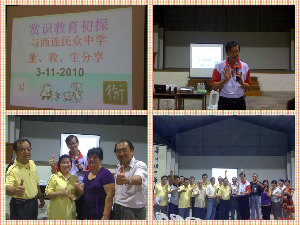 10-11-03 赏识教育初探《与西连民众中学董、教、生分享》 myxingzh / November 3, 2010 赏识教育初探 《与西连民众中学董、教、生分享》 日期:2010年11月3日 单位:西连民众中学 对象:董事长、署理董事长、董事们、曾主席和曾夫人,学生、老师们