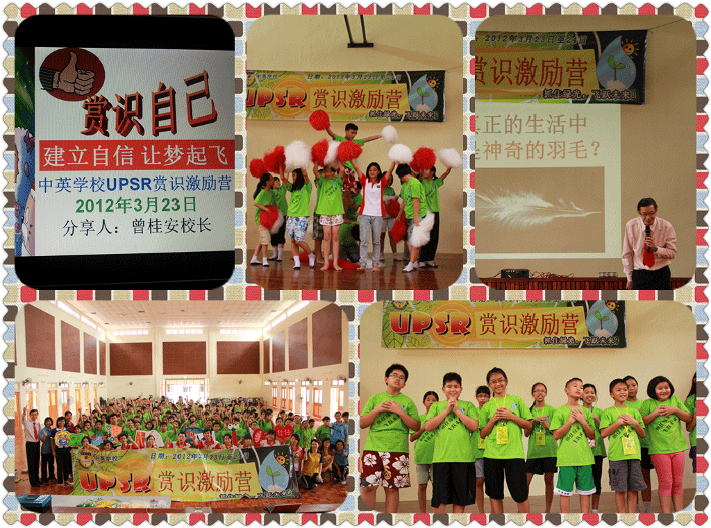 12-03-23&24 激励营《抓住绿光,飞跃未来》 Adeline Lo / March 23, 2012 UPSR赏识激励营《抓住绿光,飞跃未来》 主题:赏识自己《建立自信让梦起飞》 日期:2012年3月23日-24日人数:全体小六生150位,15位老师,校长、家教协会、家长单位:亚庇中英学校对象:老师,学生