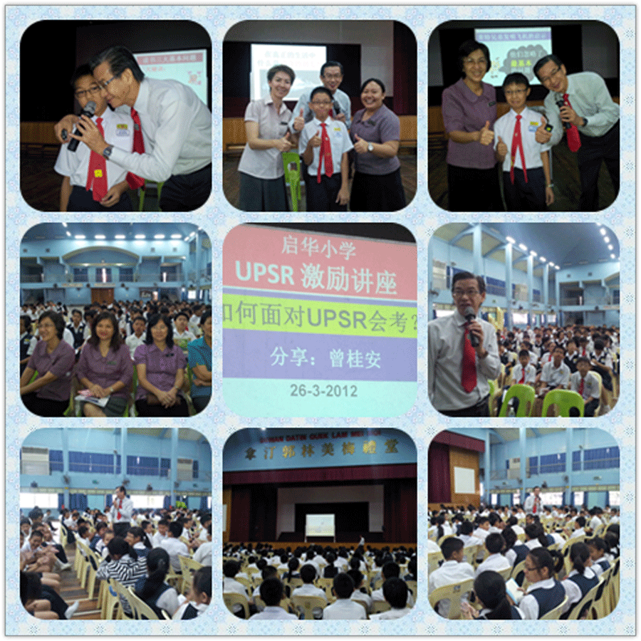 12-03-26 UPSR激励讲座《如何面对UPSR会考?》 Adeline Lo / March 26, 2012 UPSR激励讲座 《如何面对UPSR会考?》 日期:2012年3月26日 人数:230位学生、10位老师、校长 单位:山打根启华小学 对象:校长、副校长、学生 地点:启华小学礼堂