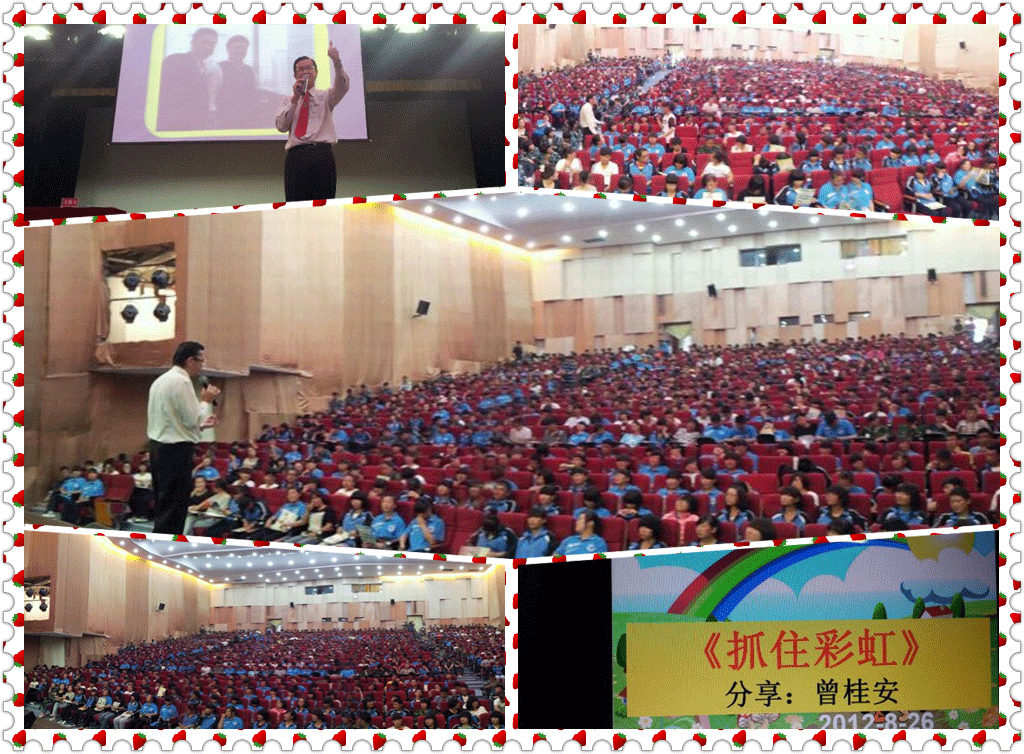 12-08-26 激励讲座《抓住彩虹》 Adeline Lo / August 26, 2012 赏识激励讲座 《抓住彩虹》 日期:2012年8月26日 人数:1000位 单位:1所 单位名字:伊金霍洛高级中学 对象:高中一,二学生 地点:伊金霍洛高级中学讲堂