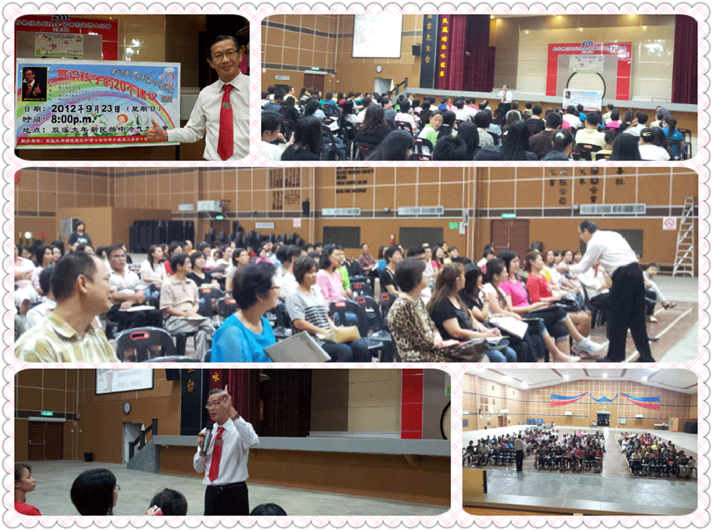 12-09-23 亲子讲座《赏识孩子的20个建议(下)》 Adeline Lo / September 23, 2012 赏识教育亲子系列讲座-第四讲 《赏识孩子的20个建议(下)》 日期:2012年9月23日 人数:200 单位:双溪大年新民独立中学 对象:校长,全体行政人员,家长,学生
