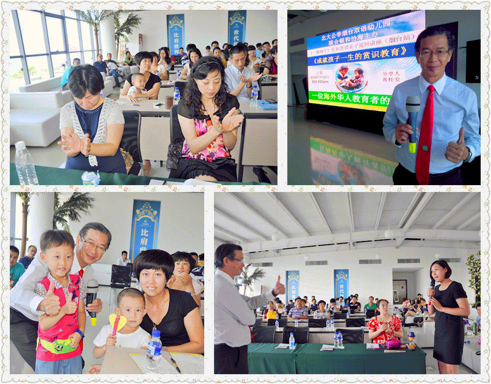 14-07-07 亲子讲座系列《成就孩子一生的赏识教育》 myxingzh / July 7, 2014 行知赏识亲子讲座系列《成就孩子一生的赏识教育》 教育要从感恩开始 爱孩子要严格要求是对的,但不能够粗暴,也不能够放纵 教孩子要会教会他感恩,教孩子的第一句话:谢谢 日期:2014年7月7日 人数:200 单位:山东北大公学烟台双语幼儿园 对象:幼儿园,老师,家长