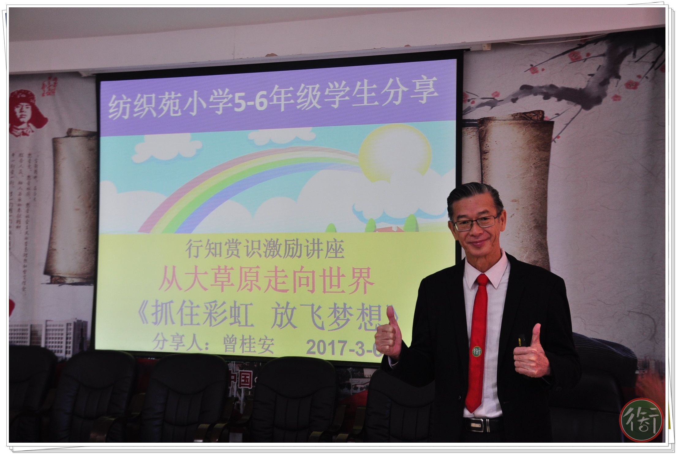 滋润失败的心田,让信心扬起风帆,播种人类的春天……随着一首《翘起你的大拇指》今天的讲座开始了!从大草原走向世界《抓住彩虹 放飞梦想》让我们走向世界做地球村主人!曾教授的精彩演讲把我心带向了远方