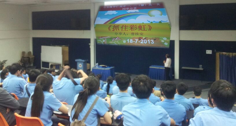 13-07-18 讲座《抓住彩虹》 Adeline Lo / July 18, 2013 行知赏识讲座 《抓住彩虹》 日期:2013年7月18日 人数:100位 单位:峇株华仁独中 对象:高中一,二(服)及一美学生 地点:峇株华仁独中