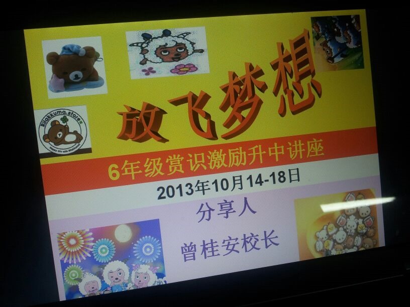 13-10-17 讲座 (古晋中华第四中学的招生活动) Adeline Lo / October 17, 2013 行知赏识讲座 《放飞梦想》 日期:2013年10月17日 人数:第一场109位;第二场100位 单位:四哩半中华公学 对象: 6年级同学 地点:四哩半中华公学