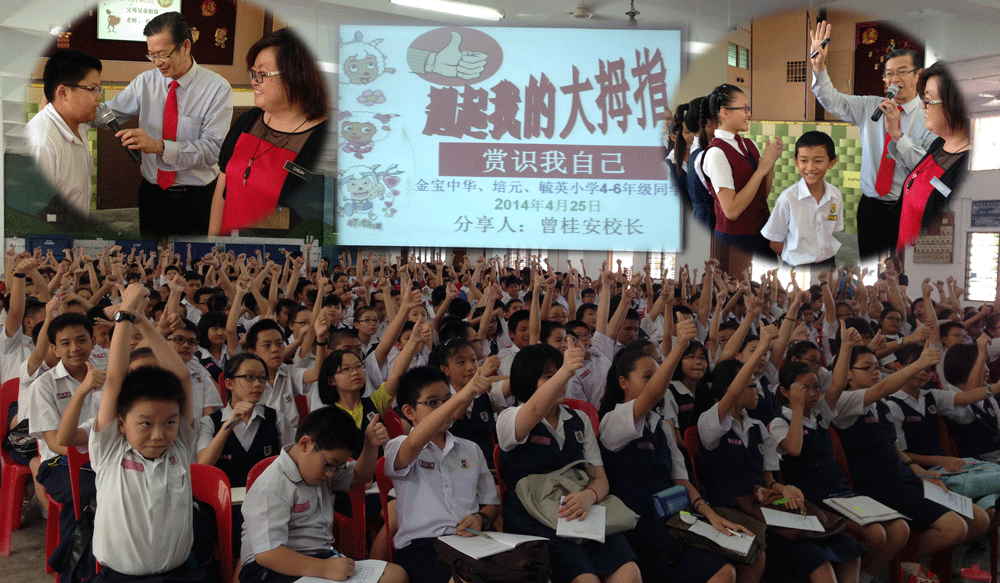 14-04-25 激励讲座《赏识我自己》 myxingzh / April 25, 2014 “翘起我的大拇指”《赏识我自己》 你快乐吗? 快乐很重要 父母和老师都是爱的使者 全世界最有爱的人就是父母和老师 今天你天天有爱的正能量,你肯定很幸福 然后爱孩子也会爱得很幸福,孩子也被你爱得满满。 日期:2014年4月25日 人数:100 单位:2所-金宝中华、培元小学 对象:老师, 副校长, 家长