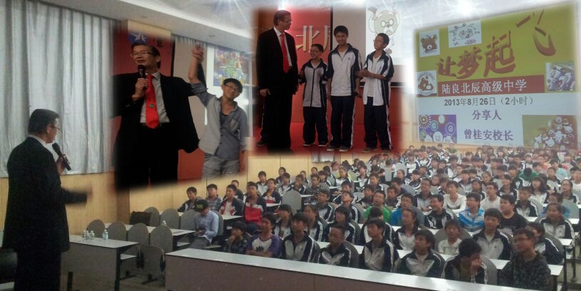 13-08-26 讲座《让梦起飞》 Adeline Lo / August 26, 2013 行知赏识讲座《让梦起飞》 日期:2013年8月26日 人数: 350位 单位:1所 单位名字:云南陆良北辰高级中学 对象:全体初二 地点:云南陆良北辰高级中学