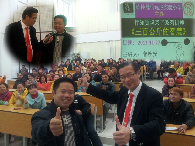 13-11-27 讲座 《300公斤的智慧》 Adeline Lo / November 27, 2013 行知赏识亲子讲座《三百公斤的智慧》 日期:2013年11月27日 人数:1300 单位:1所 单位名字:桂林临桂县冠信远辰实验小学 对象:全体家长,老师,校长,副局长 地点:桂林临桂县冠信远辰实验小学