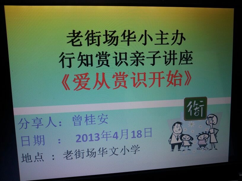 13-04-18 亲子讲座 《爱由赏识开始》 Adeline Lo / April 18, 2013 行知赏识亲子讲座 《爱由赏识开始》 日期:2013年4月18日 人数:150位 单位:双溪大年老街场华小主办 对象:家长 地点:双溪大年老街场华文小学