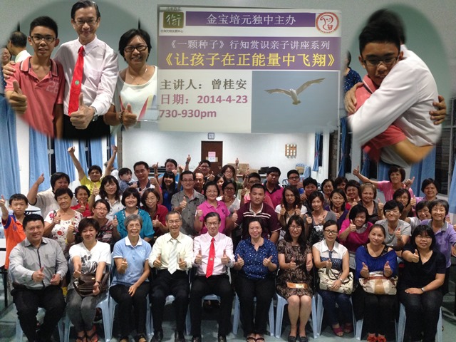 行知赏识亲子讲座 myxingzh / June 24, 2014 《一颗种子》行知赏识讲座系列《让孩子在正能量中飞翔》 日期:2014年4月23日 人数:80 单位:金宝培元独立中学 对象:校长, 老师 家长 父母老师教会孩子飞翔吧! 孩子犯错的时候是给你教他的时候 教是一种正能量 为什么孩子读不到书,因为他每次收到负能量 现在孩子读书你要给他更高的需求 爱是一种心态,假如你有好的心态,你就有好的人生