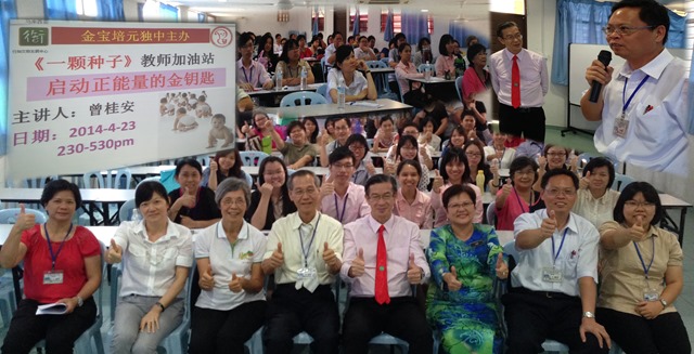 行知赏识加油站 myxingzh / June 24, 2014 一颗种子:老师加油站 《启动正能量的金钥匙》 日期:2014年4月23日人数:60单位:4所-金宝培元独立中学、金宝华乐华小、武吉白家华小、冷水河华小对象:老师,校长 教育是一颗种子,种子就是爱。爱是什么种子呢?就是心态的种子。学会爱的最基本功就是爱好自己。请问这段日子有没有时常伤害自己呢?要爱好自己,先从不要伤害自己开始。要孩子活出了,你有活出来吗?要同学自爱,那你们有爱好自己吗?把所有的笔记要化成行动,你才可以学的到的。不要小看一颗种子,因为每个老师都是一颗爱的种子。