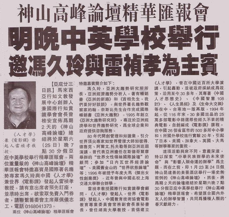 14.01.23 神山高峰论坛精华汇报会明晚中英举行邀冯久玲雷桢孝为主宾