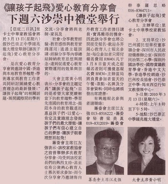 10 03 02 《让孩子起飞》爱心教育分享会,下周六沙崇中礼堂举行