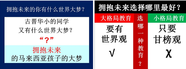 因为世界已经变成了地球村了!我们要选择大格局学校,有世界观的教育,我们不要选择一所小格局的学校,只有甘榜观的教育。