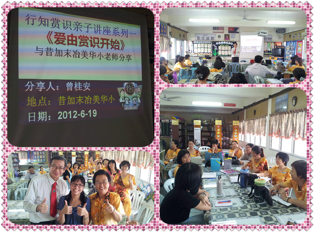 12-06-19 亲子讲座《爱由赏识开始》 Adeline Lo / June 19, 2012 行知赏识亲子讲座系列一 《爱由赏识开始》 日期:2012年6月19日 人数:25 单位:昔加末冶美学校 对象:校长,老师
