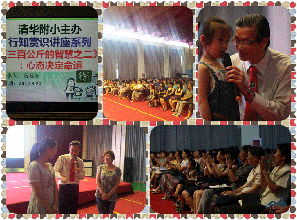12-08-20 亲子讲座《三百公斤的智慧之二》 Adeline Lo / August 20, 2012 赏识教育亲子系列讲座 第二场《三百公斤的智慧之二》 “心态决定命运” 日期:2012年8月20日 早上 人数:400位 单位:北京清华附小 对象:校长,老师,家长