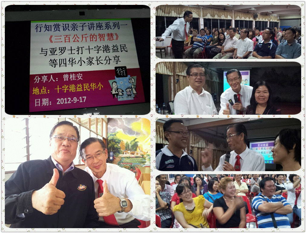 12-09-17 亲子讲座《三百公斤的智慧》 Adeline Lo / September 17, 2012 行知赏识亲子讲座系列一 《三百公斤的智慧》 日期:2012年9月17日 时间: 7:00pm- 9:30pm 单位:亚罗士打学校十字港益民,新民,益群,文德华文小学 出席人数:150位 出席人:家长,校长,老师 地点:亚罗士打学校十字港益民华小讲堂