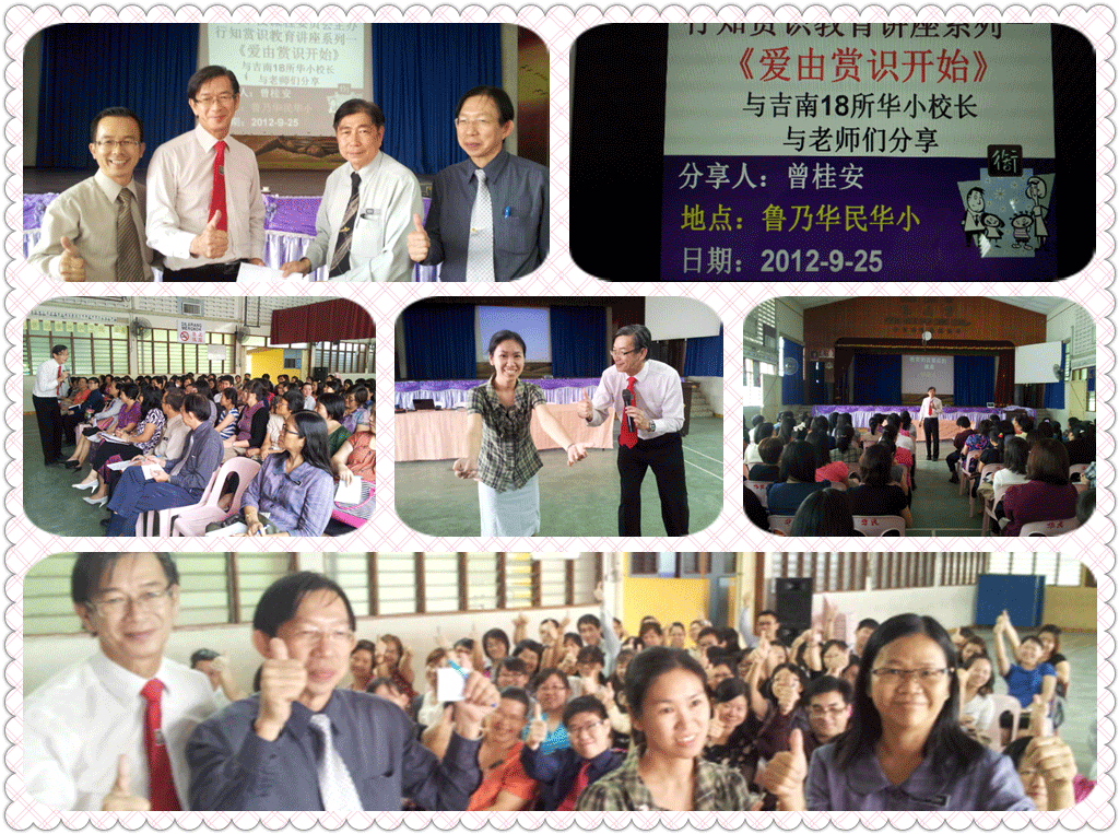 12-09-25 讲座《爱由赏识开始》 Adeline Lo / September 25, 2012 行知赏识教育讲座:《爱由赏识开始》 日期:2012年9月25日 人数:120 单位:吉南18所华小 对象:校长,老师