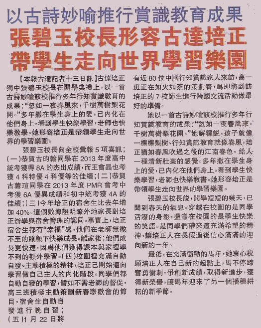 14-01-13 古诗妙喻赏识教育成果,培正张碧玉校长带学生走向世界学习乐园