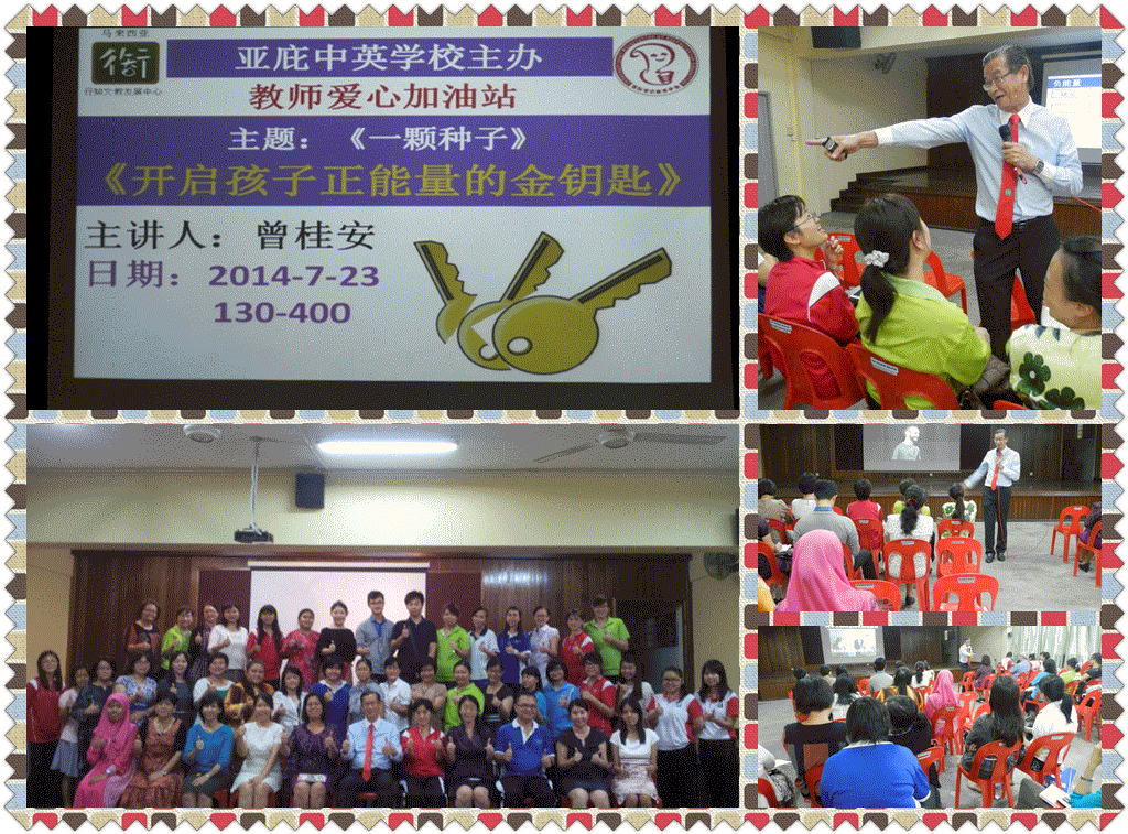 14-07-23 加油站《开启孩子正能量的金钥匙》 myxingzh / July 23, 2014 行知赏识加油站《开启孩子正能量的金钥匙》 每一位教师家长都是一颗珍贵的种子,只要心中有爱,你就是一颗种子。 一颗种子在黑暗的泥土中,因为受到老师们的爱心, 即使在黑暗中也感觉到一颗种子的力量。 因为您的爱心,让这颗种子能够冲破黑暗,破土而出。 那是因为您的爱心,给了她成长的正能量, 因为您的正能量,让种子看到阳光,让它萌芽长叶! 谢谢你老师,付出,让校园里的种子都能够长开叶子,让他们的笑容面对快乐的明天。 只要您心中充满爱,你就是一颗种子,有了健康的教育种子,我们的教育有希望。 日期:2014年7月23日 人数:40 单位:亚庇中英学校 对象:全校老师,副校长,校长
