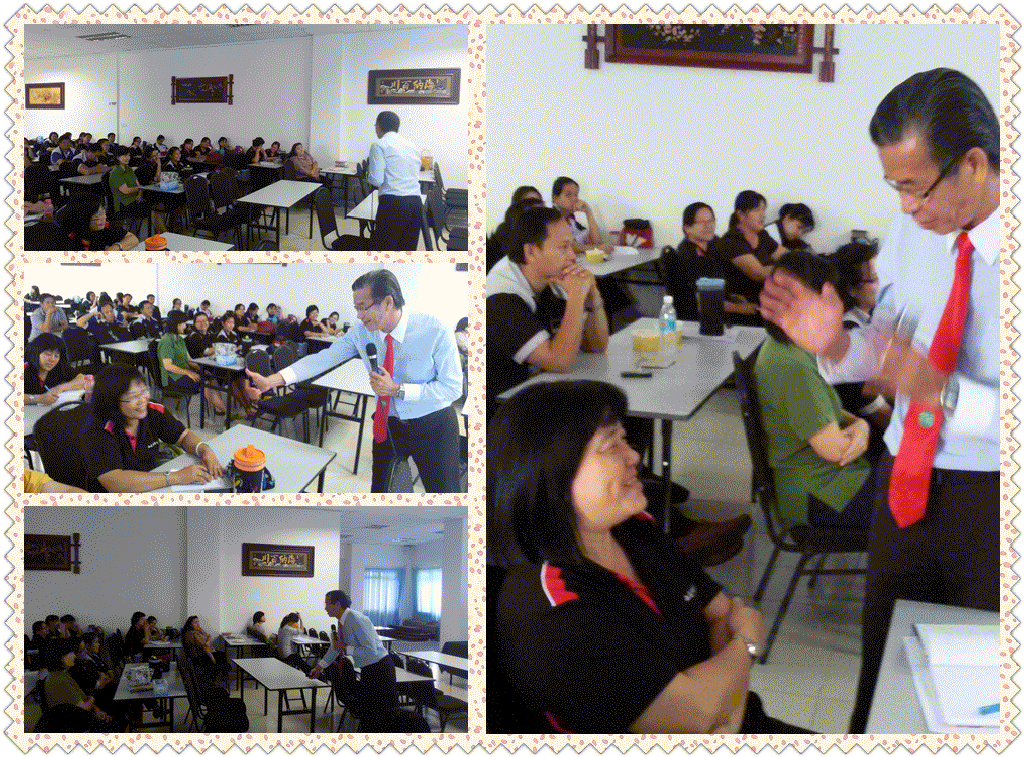 14-08-01 加油站《幸福老师的金钥匙》 myxingzh / August 1, 2014 题目:行知赏识加油站《幸福老师的金钥匙》 爱的法则就是吸引力法则;给予正面,收回正面。老师不要负面的对待孩子。 师长负面,孩子负面。抱怨,责备,生气,贬低,批评,羞辱都是付出负能量。 孩子是要教的。提醒,肯定,鼓励,讲理由都是付出正能量, 给予正面,收回正面。教育以过程为中心:没有过程的结果,都是假的。 教育不能拔苗助长,要尊重规律,耐心等待,重视过程。 日期:2014年8月1日 人数:40 单位:古晋西连中华公学 对象:全体老师,校长