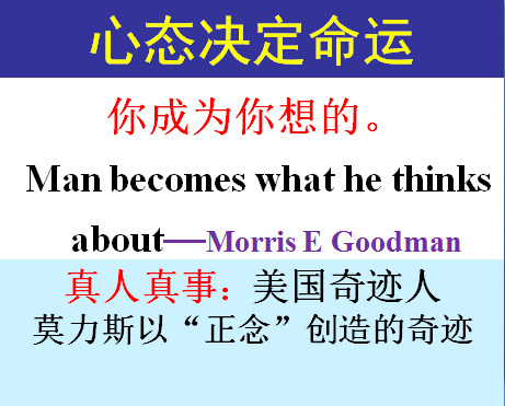 心态的转变——从负面心态转变成正面心态;最难之处: 信念的转变。你的感觉正在所造你未来的经历所以信念真不简单啊! 心只要你想要的,你就会成为你想的。