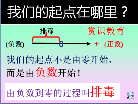 排毒起点 我们在学习赏识教育的时候,是从负数开始,而由负数到零的过程叫【排毒】,就是从爬错的梯子上下来。