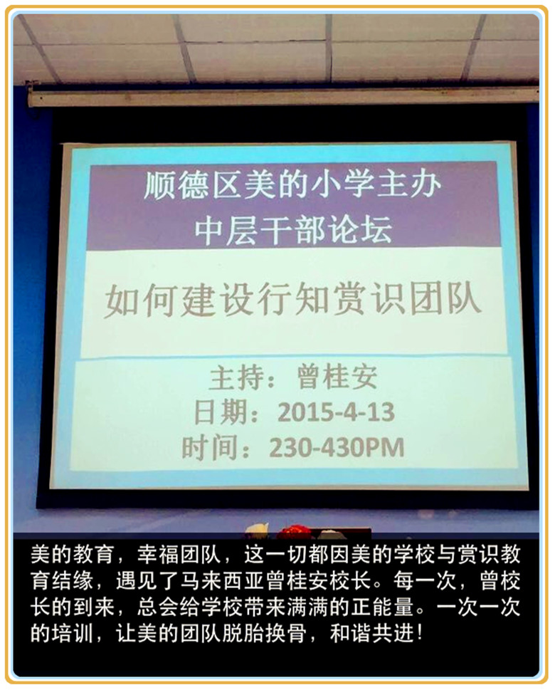 15-04-13 佛山市顺德美的学校中层干部培训《如何建设行知赏识团队》 Adeline Lo / April 14, 2015 行知赏识论坛:《如何建设行知赏识团队》 地点:佛山市顺德美的学校讲堂 学校: 顺德美的学校 人数:28位 出席人:校长,中层干部,大队辅导员 今天要打造“真爱”的团队, 这样的团队队伍秘诀在哪里?——秘诀在”改变自己“ 如何改变自己?——那就是自己要做,爱好自己,爱好家人。 来自于张美如校长在微信里的心得分享 思考: 作为领袖,个人的素质应该要拥有怎样的格局,和要拥有怎样的心态? 而这个领袖的素质如何决定群体或团队的命运?