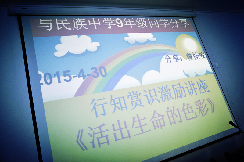 15-04-30 云南砚山民族中学《活出生命色彩》 Adeline Lo / May 5, 2015 行知赏识激励讲座:《活出生命色彩》 地点:云南砚山民族中学讲堂 单位:云南砚山民族中学 人数: 100位 出席人:优秀学生