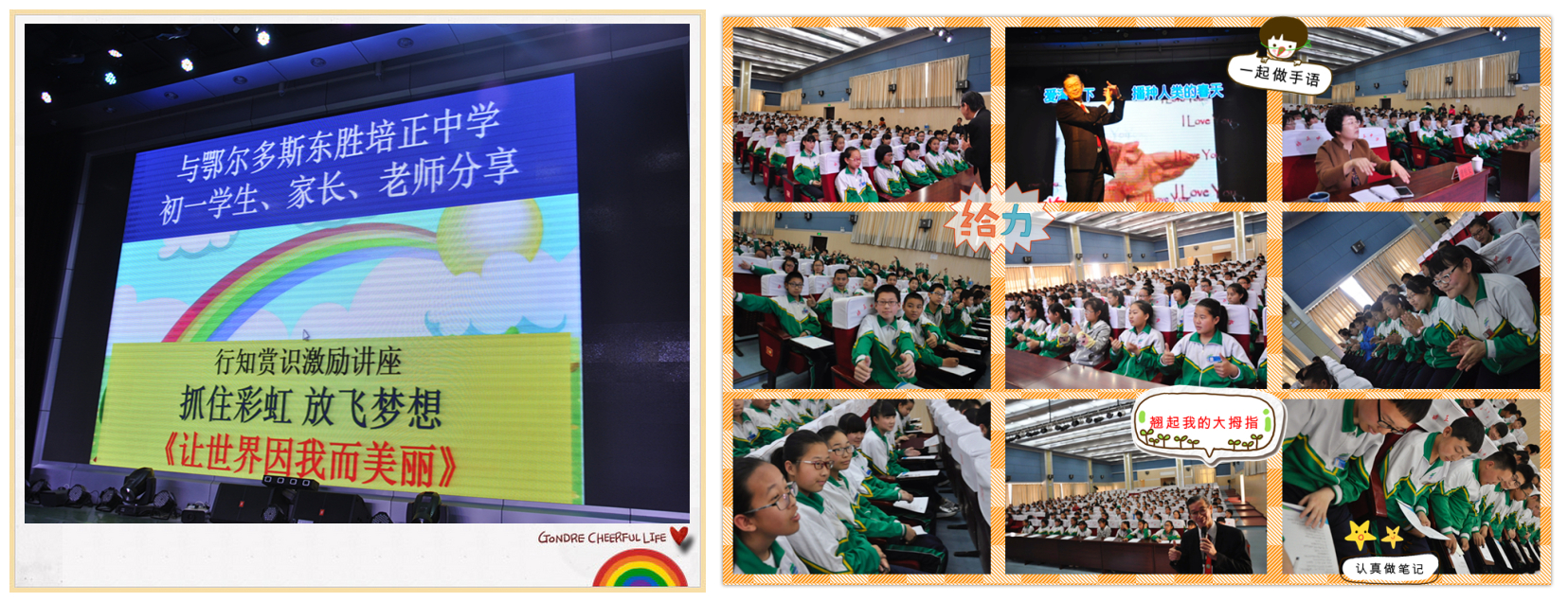 (2016年4月13日讯)国际讲师曾桂安校长与罗志慈国际行知志工早上来到了鄂尔多斯东胜培正中学为该校300位学生进行了一场行知赏识激励讲座,主题为《抓住彩虹,放飞梦想》。这次的讲座除了学生,还有邀请了家长们一起参与我们,同时这也是我们第一次和同学们分享。整个场面非常热闹,每当曾校长请教同学的时候,每个孩子给予的反应都很好,每个非常积极踊跃与曾校长互动。