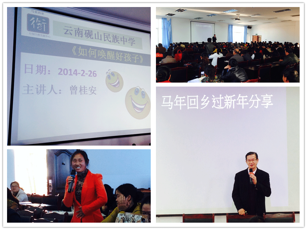 14-02-26 行知赏识加油站(2)《如何唤醒好孩子》 Adeline Lo / February 26, 2014 行知赏识加油站(2)《如何唤醒好孩子》 日期:2014年2月26日 人数:170位 单位:1所 单位名字:云南省文山州砚山县民族中学 对象:全体老师 地点:云南省文山州砚山县民族中学