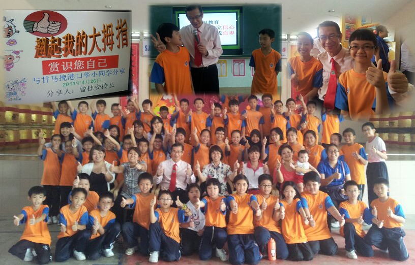 13-04-26 讲座《翘起我的大拇指》 Adeline Lo / April 26, 2013 爱心计划学校 行知赏识讲座《翘起我的大拇指》 “赏识您自己” 日期:2013年4月26日 人数:200位 单位:甘马挽港口华小 对象:甘马挽港口华小学生 地点:甘马挽港口华小