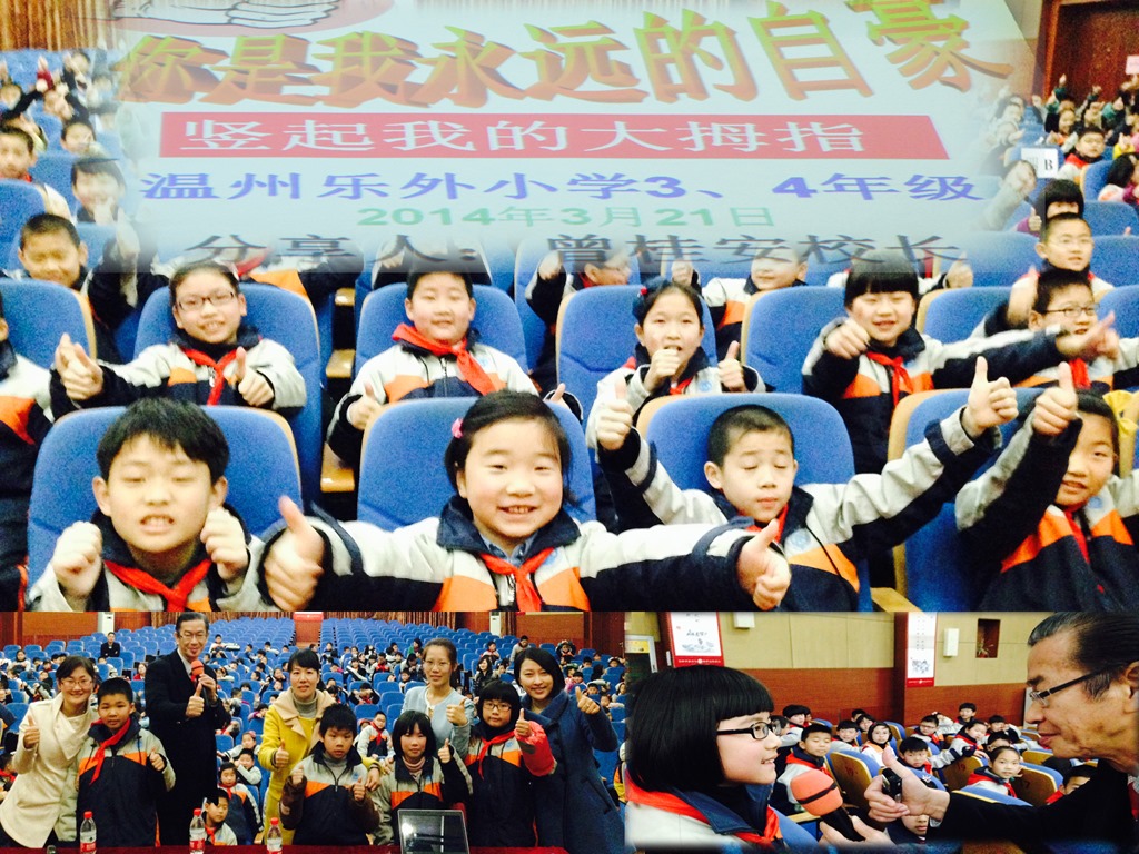 14-03-21 激励讲座 《你是我永远的自豪》 Adeline Lo / March 21, 2014 翘起我的大拇指 《你是我永远的自豪》 你怕犯错吗?每个人都要在犯错中长大,因为困难和失败都是智慧的泉源。要成功一定要经历失败,所以“失败为成功之母”赏识成功谁不会,赏识失败才是真英雄。 日期:2014年3月21日 人数:370 单位:温州乐清外国语学校 对象:全校4年级的学生