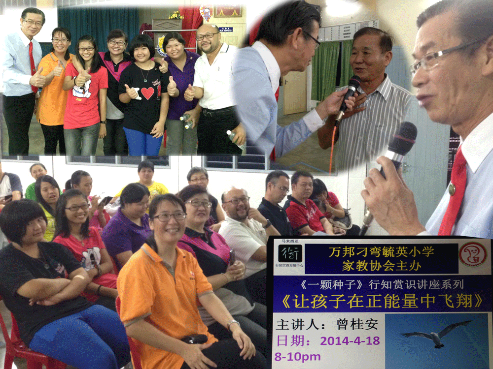 14-04-18 亲子讲座 《让孩子在正能量中飞翔》 myxingzh / April 18, 2014 《一颗种子》行知赏识讲座系列 《让孩子在正能量中飞翔》 日期:2014年4月18日 人数:80 单位:3所单位- 霹雳州金宝万邦刁毓英华小家教协会主办、万邦刁华小、甘榜地马华小 对象:家长、老师、校长